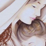 Quadro sacro moderno raffigurante madonna col bambino dipinto ad olio su base in tela.